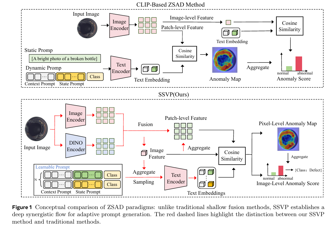 异常检测的有效性取决于视觉表示的粒度。CLIP (Radford et al., 2021; Lv et al., 2025) 利用大规模的图像-文本对在视觉特征和语言概念之间建立强大的对齐。这赋予了它强大的全局语义理解能力。然而,它缺乏工业检测所需的像素级判别能力。相比之下,DINO (Oquab et al., 2023; Siméoni et al., 2025) 利用大规模自监督训练来捕捉密集的结构和纹理细节。因此,DINO提供了细粒度的感知能力,有效地补充了CLIP的语义能力。在单模态AD领域,采用记忆库 (Roth et al., 2022; Damm et al., 2025; Batzner et al., 2024; Ammar et al., 2025) 或标准化流 (Liu et al., 2023; Yu et al., 2021) 等技术的方法已被证明非常有效。然而,一个主要的局限性是它们缺乏零样本推理能力。ZSAD的一个主要目标是增强泛化能力。为此,结合多个模型并利用它们的互补优势是有益的。然而,有效地集成这些模型仍然是一个重大挑战。虽然最近的工作如FiLo (Gu et al., 2024) 和MuSc (Li et al., 2024) 探索了多尺度对齐,但简单的融合策略常常因不同的流形拓扑而遭受特征冲突。这凸显了需要一种深度协同机制,如SSVP中提出的那样,以有效地将判别性结构先验注入语义空间。