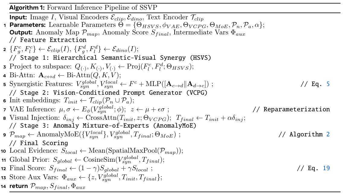 在本节中,我们将详细阐述所提出的SSVP框架。如图2所示,SSVP旨在通过深度跨模态协同来解决零样本异常检测中的关键挑战:特征粒度瓶颈、语义漂移和粗粒度判别。通过协同融合高层语义上下文和多尺度结构细节,该框架建立了一种强大的视觉-语义对齐机制,能够在没有目标域监督的情况下识别未见缺陷。该框架由三个逻辑上耦合的模块组成。(1) 分层语义-视觉协同 (HSVS)通过将DINO的细粒度结构特征对齐并注入CLIP语义流形来构建鲁棒的视觉表示。(2) 视觉条件提示生成器 (VCPG)将增强的视觉特征作为强先验注入潜在空间,并利用跨模态注意力引导文本嵌入精确锚定在缺陷区域。(3) 视觉-文本异常映射器(VTAM)建立了一种局部-全局交互范式,通过局部细节动态修正全局评分,以增强检测灵敏度。详细的前向推理流程见算法1。