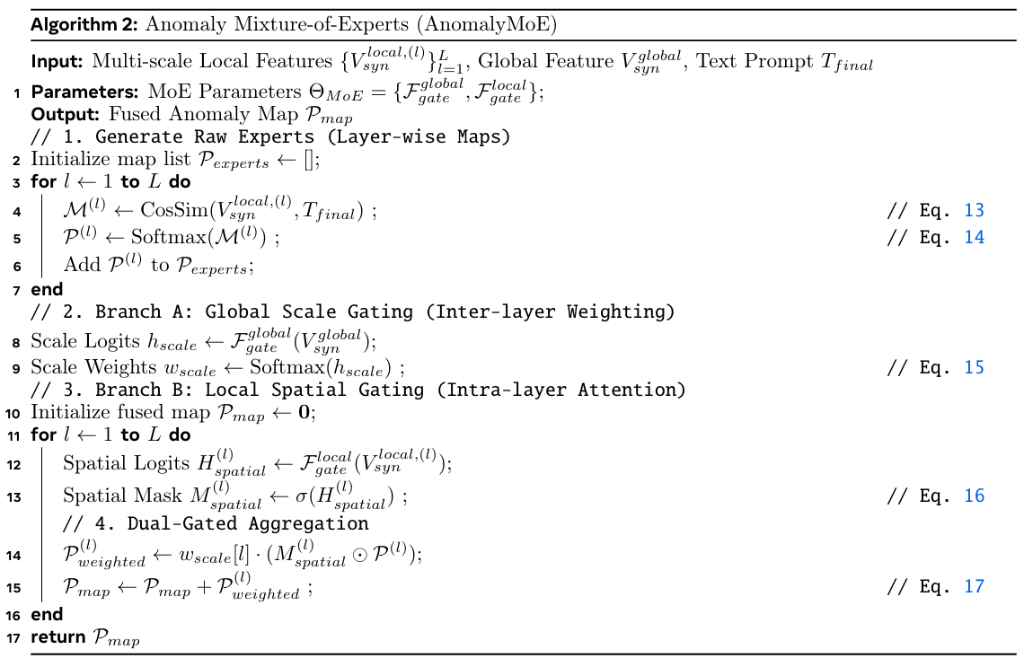 现有的ZSAD方法受限于全局和局部表示的不一致。全局语义常常忽略细粒度的异常信号,而静态聚合无法适应在不同尺度上表现的缺陷。为解决此问题,我们引入了一个异常混合专家(AnomalyMoE)模块,该模块通过双门控机制动态路由多尺度特征,确保在全局校准之前进行精确定位。