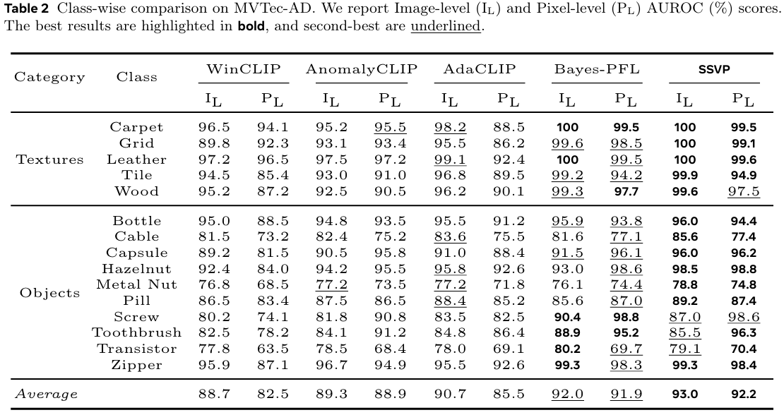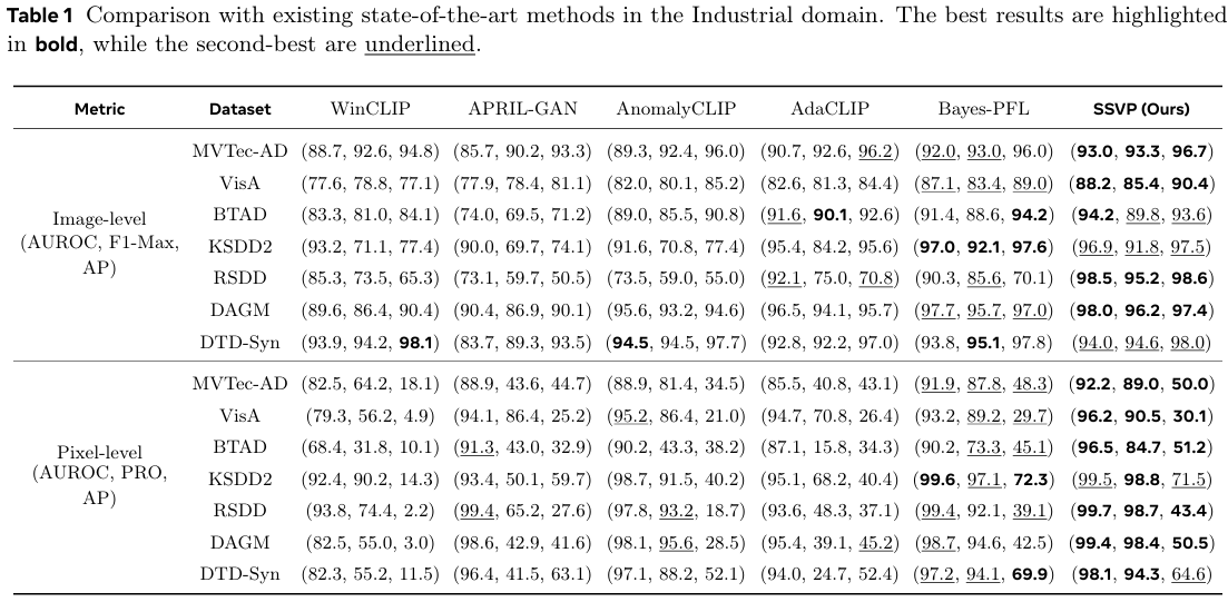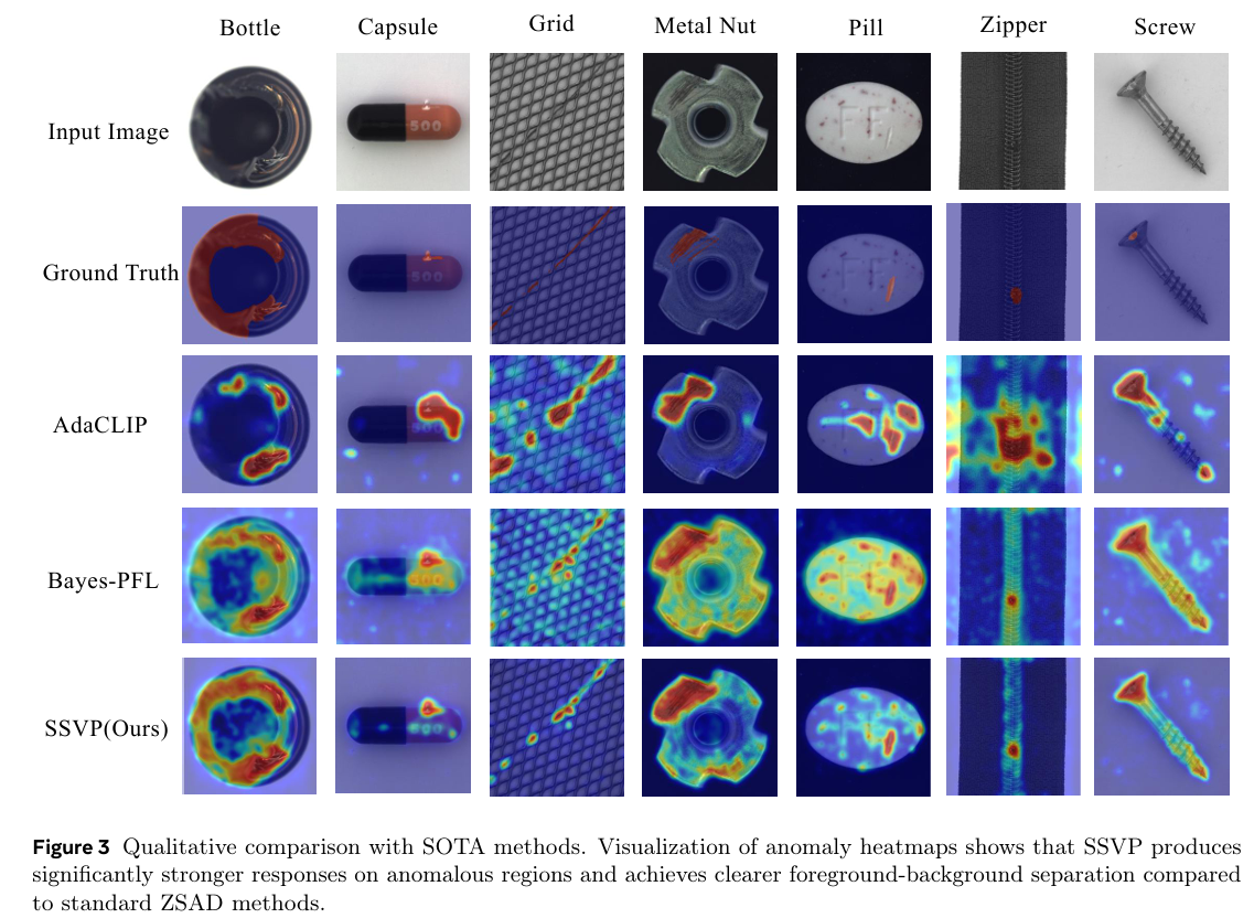 我们将 SSVP 与领先的零样本异常检测(ZSAD)方法进行比较,包括:(1) 静态提示方法:WinCLIP(Jeong et al., 2023)、APRIL-GAN(Chen et al., 2023);(2) 动态提示方法:AnomalyCLIP(Zhou et al., 2023)、AdaCLIP(Cao et al., 2024)、Bayes-PFL(Qu et al., 2025)。