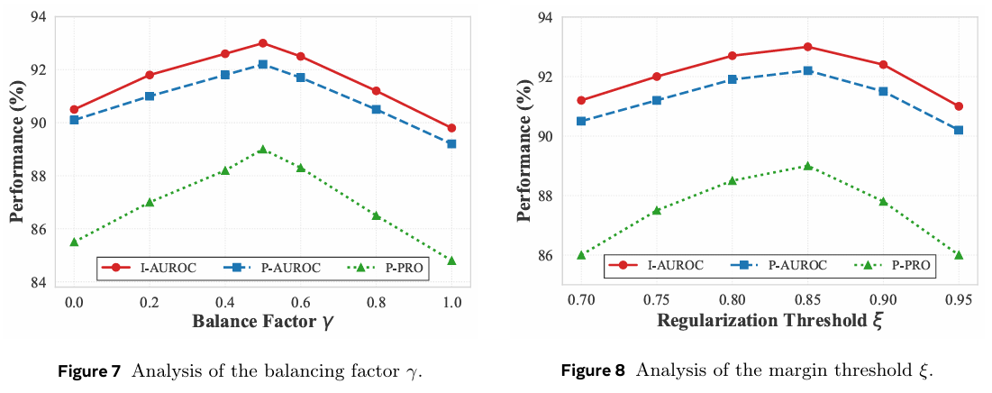 图 7 和图 8 展示了平衡因子 γ\gammaγ 与边界阈值 ξ\xiξ 的敏感性。性能在 γ=0.5\gamma = 0.5γ=0.5 时达到峰值,该值能最优地平衡缺陷检测与噪声抑制;ξ=0.85\xi = 0.85ξ=0.85 能有效正则化语义,在防止漂移的同时保持足够的多样性以捕获多样化的异常。