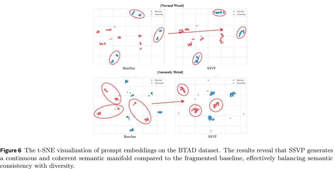 图 6 展示了 BTAD 数据集上的 t-SNE 嵌入。与基线分布中离散的聚类相比,SSVP 形成了一个连贯的流形,证实了我们的视觉条件机制保持了语义一致性。提示组的独特排列进一步确保了在捕获多样化异常时的多样性,同时与类别语义保持对齐。