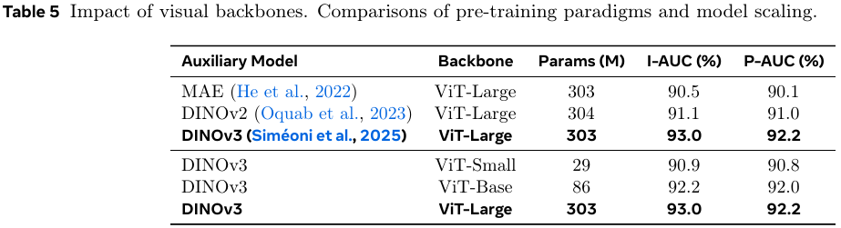 表 5 评估了视觉骨干网络。DINOv3(自监督)优于基于重建的 MAE(93.0%93.0\%93.0% vs. 90.5%90.5\%90.5% 图像级 AUROC)。将 DINOv3 从 ViT-Small 扩展到 ViT-Large 带来了持续的性能提升,证实了更大的模型为异常检测提供了更丰富的结构细节。