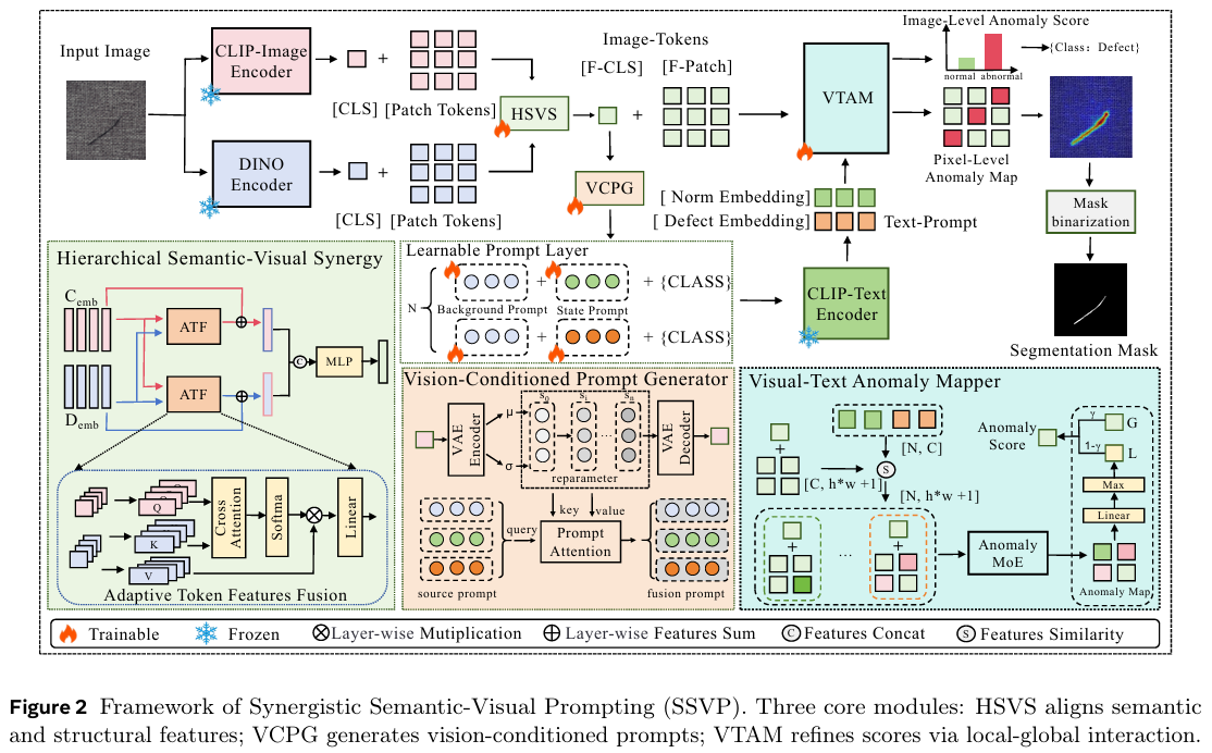 具体来说,我们通过三个技术上截然不同的模块来实例化此方法。首先,为弥合特征粒度差距,我们设计了分层语义-视觉协同 (HSVS)机制。详细来说,HSVS采用一个自适应令牌特征融合 (ATF)块,该块利用双路径跨模态注意力来对齐不同的特征,并通过可学习的投影矩阵显式地将DINOv3的多尺度结构先验注入到CLIP的语义流形中。其次,为缓解确定性提示的局限性,我们提出了视觉条件提示生成器 (VCPG)。该模块利用变分自编码器(VAE)对视觉异常的潜在分布进行建模,并采用文本-潜在交叉注意力机制。这种设计允许文本嵌入通过重参数化技巧动态地"检索"并集成生成性的视觉偏差,从而确保对未见缺陷模式的鲁棒锚定。第三,为克服全局-局部脱节问题,我们构建了视觉-文本异常映射器 (VTAM)。该模块实现了一种由双门控机制驱动的异常混合专家(AnomalyMoE)范式,涵盖全局尺度选择和局部空间滤波。通过自适应地路由多尺度特征并用显著的局部证据校准全局评分,VTAM确保了精确的异常定位。