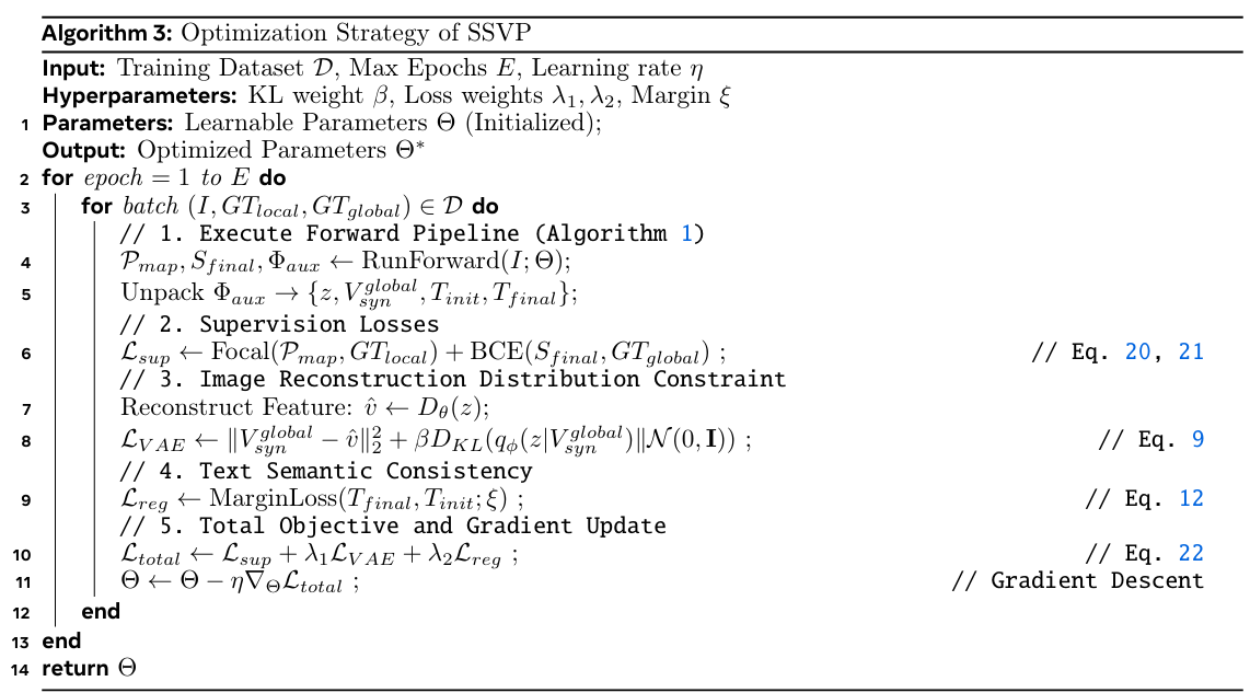其中 LVAE\mathcal{L}{VAE}LVAE 和 Lreg\mathcal{L}{reg}Lreg 分别强制潜在分布约束和语义一致性约束,由超参数 λ1\lambda_1λ1 和 λ2\lambda_2λ2 进行平衡。完整的优化过程(包括这些损失的计算和梯度更新步骤)总结在算法 3 中。