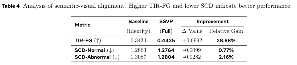 如表 4 所示,与基线相比,SSVP 将 TIR-FG 相对提升了 28.88%28.88\%28.88%,验证了我们的动态提示能有效锚定判别性视觉缺陷。对于正常和异常提示,SCD 指标均有所下降,表明我们基于边界的正则化有效防止了语义漂移并保持了类别保真度。