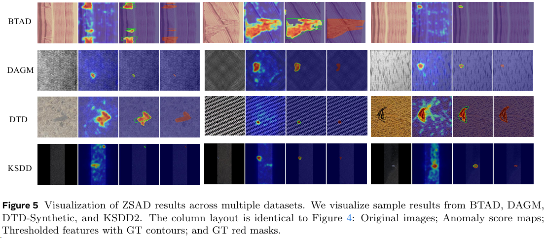 我们还在四个额外的挑战性基准数据集(BTAD、DAGM、DTD-Synthetic 和 KSDD2)上进一步评估了 SSVP 的鲁棒性,如图 5 所示。结果验证了我们框架强大的泛化能力。具体而言,SSVP 能很好地适应以纹理为中心的场景,在复杂图案中准确识别异常。对于具有微小缺陷的以物体为中心的数据集,该模型保持了对小目标的高敏感度。这种在不同域间的一致性表现证实,SSVP 有效地学习了可迁移的视觉 - 语义特征。