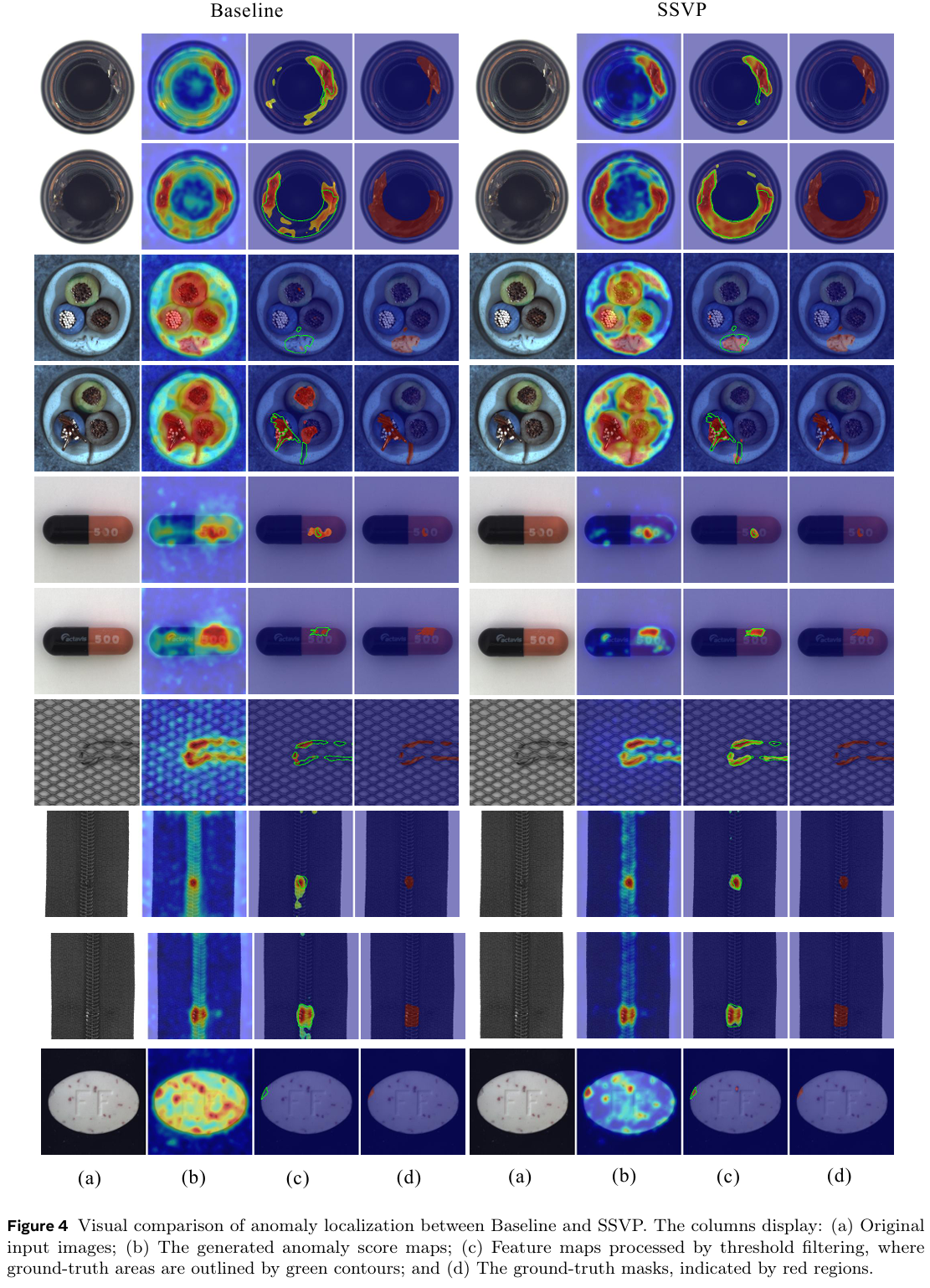所提模块的有效性。 为了进一步验证我们特定设计带来的增益,我们在图 4 中将完整模型与基线模型进行了直接对比。观察发现,在集成我们提出的组件(HSVS 和 VCPG)后,分割结果显著更加精确。具体而言,我们的方法有效抑制了基线模型在复杂背景区域中常出现的误报噪声。SSVP 展现出对小尺度目标更卓越的敏感性,能够定位基线无法捕捉的微小缺陷。生成的异常图显示出前景缺陷与正常背景之间更清晰的分离,验证了我们语义 - 视觉对齐策略的有效性。