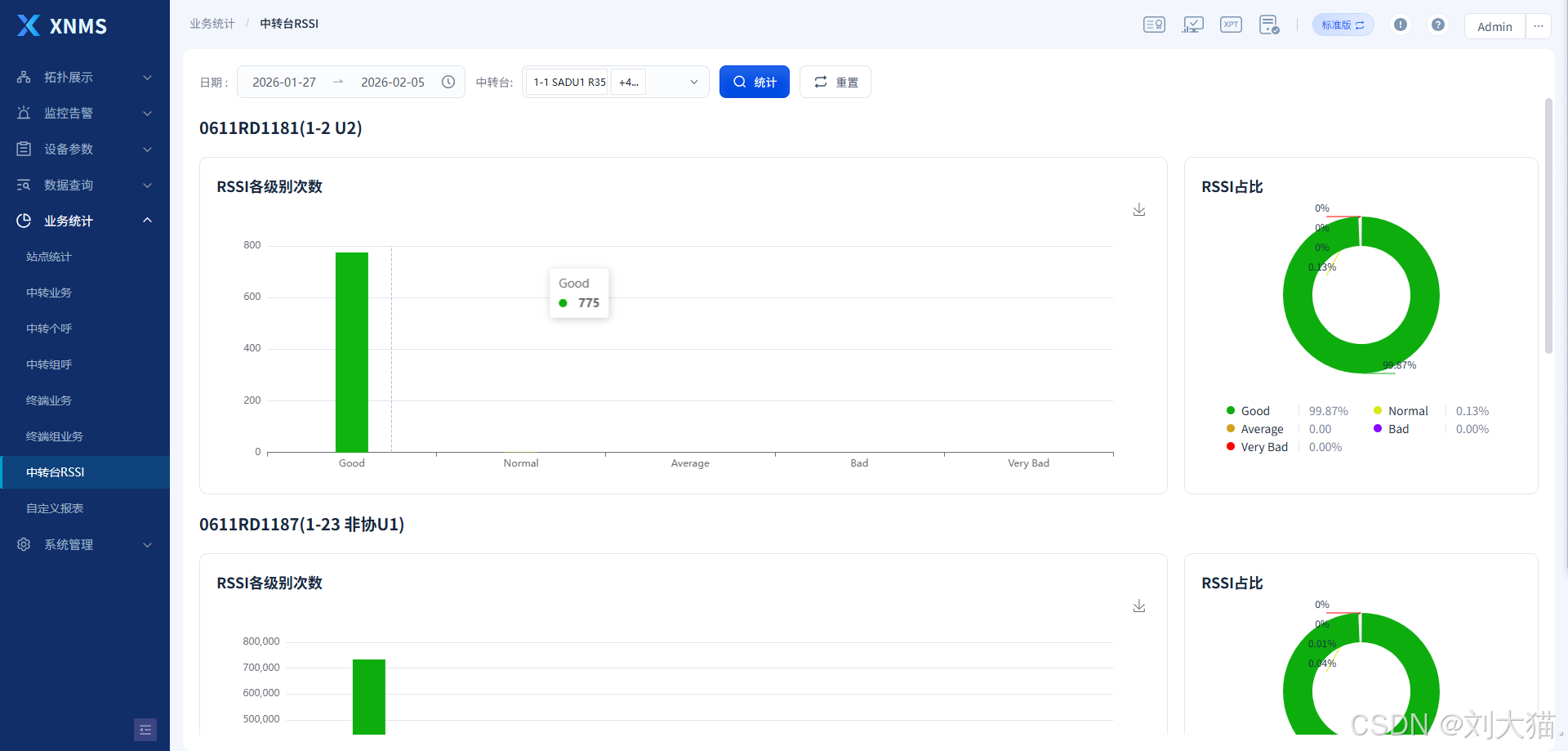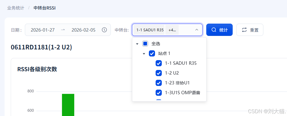 统计指定时间段内,各中转台接收终端各级别RSSI的次数及其占比。