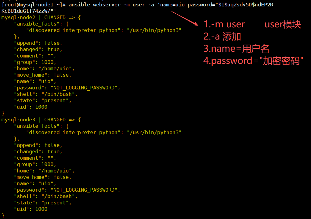 ansible webserver -m user -a 'name=uio password="$1$uq2sdv5D$ndEP2RKcBU1duGtf74zzW/"'