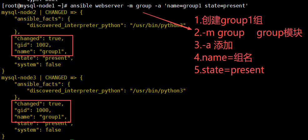 ansible webserver -m group -a 'name=group1 state=present' -创建组