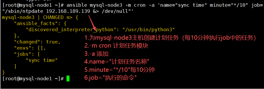 ansible mysql-node3 -m cron -a 'name="sync time" minute="*/10" job="/sbin/ntpdate 192.168.189.139 &> /dev/null"'