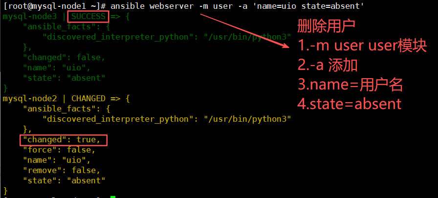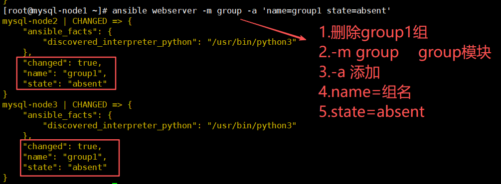 ansible webserver -m group -a 'name=group1 state=absent' -删除组