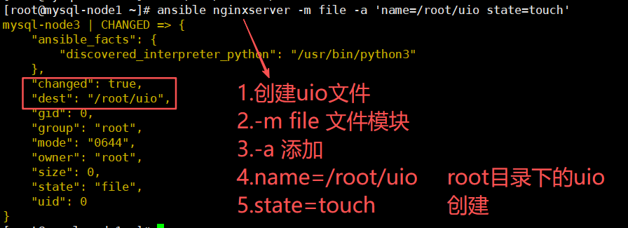 ansible nginxserver -m file -a 'name=/root/uio state=touch'
