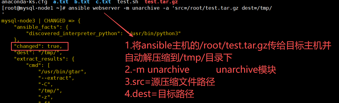 ansible webserver -m unarchive -a 'src=/root/test.tar.gz dest=/tmp/' -将压缩包传给目标主机