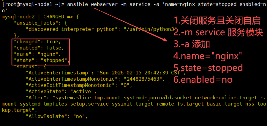ansible webserver -m service -a 'name=nginx state=stopped enabled=no' -关闭服务且关闭自启