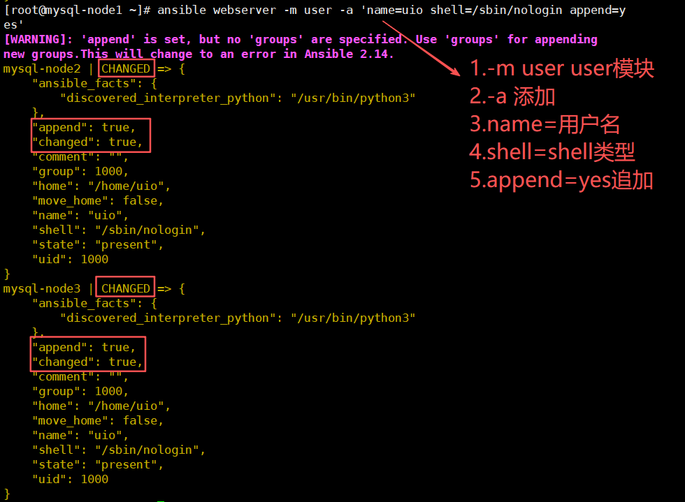 ansible webserver -m user -a 'name=uio shell=/sbin/nologin append=yes'