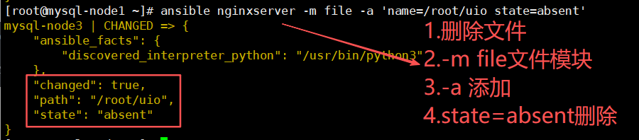 ansible nginxserver -m file -a 'name=/root/uio state=absent'