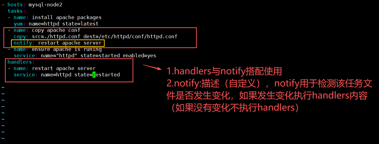 notify用于监测模块是否发生变化,如果有变化执行handlers(无变化则不执行handlers)