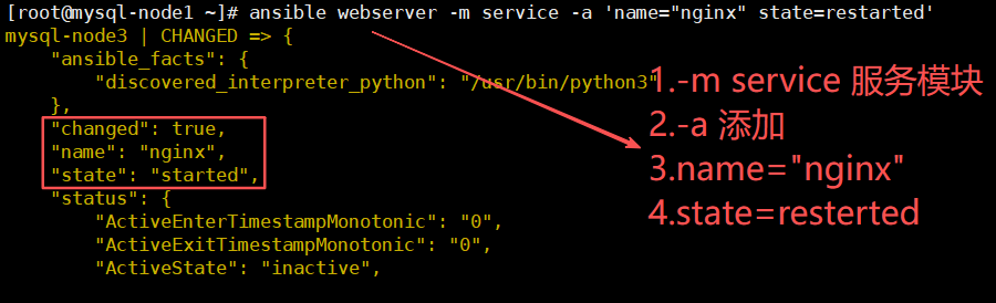 ansible webserver -m service -a 'name="nginx" state=restarted' -重启服务