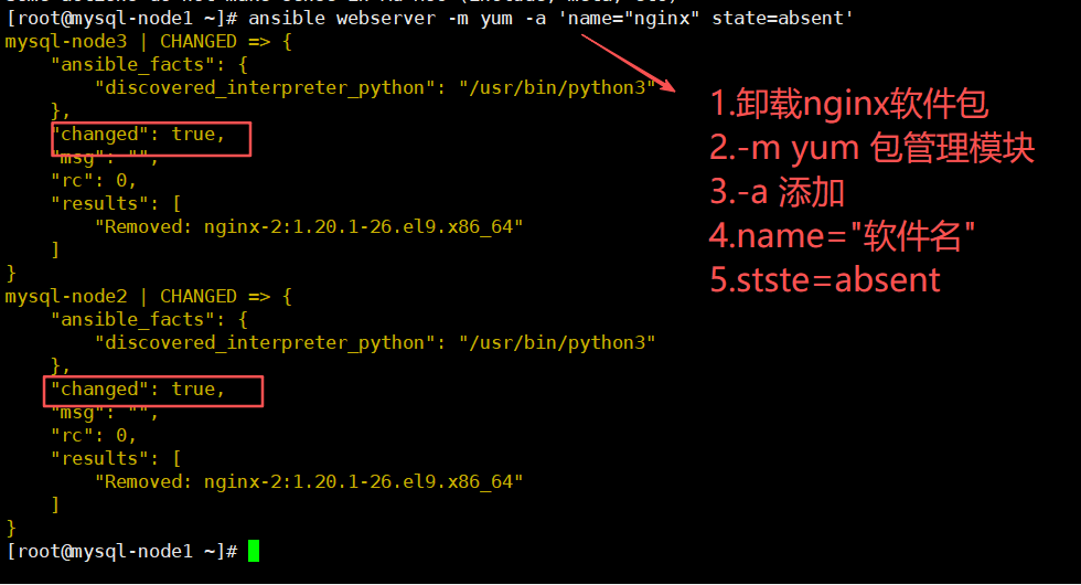 ansible webserver -m yum -a 'name="nginx" state=absent'
