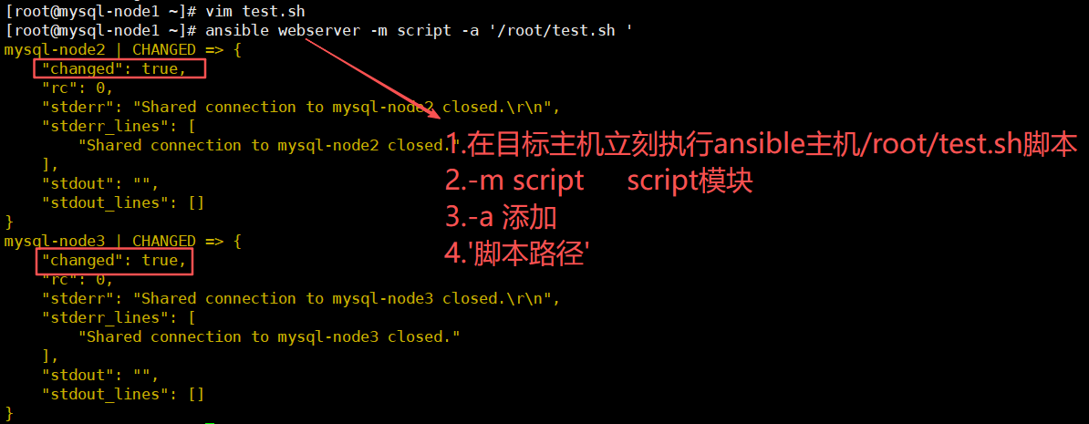 ansible webserver -m script -a '/root/test.sh ' -执行ansible主机脚本