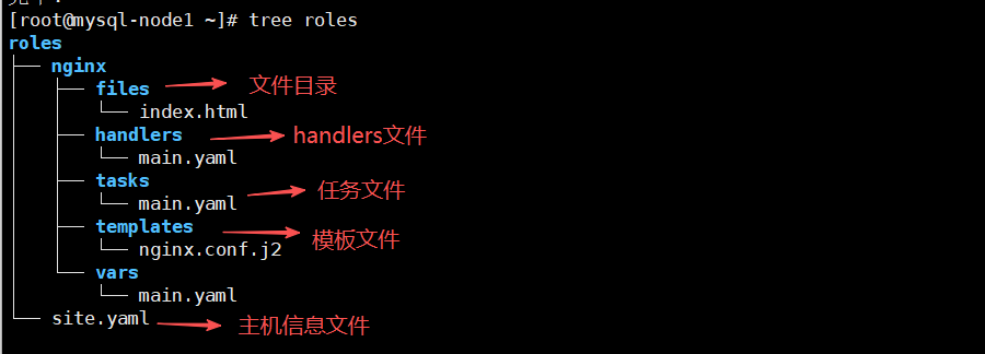 [root@mysql-node1 ~]# mkdir -p roles/nginx/{files,handlers,tasks,templates,vars}