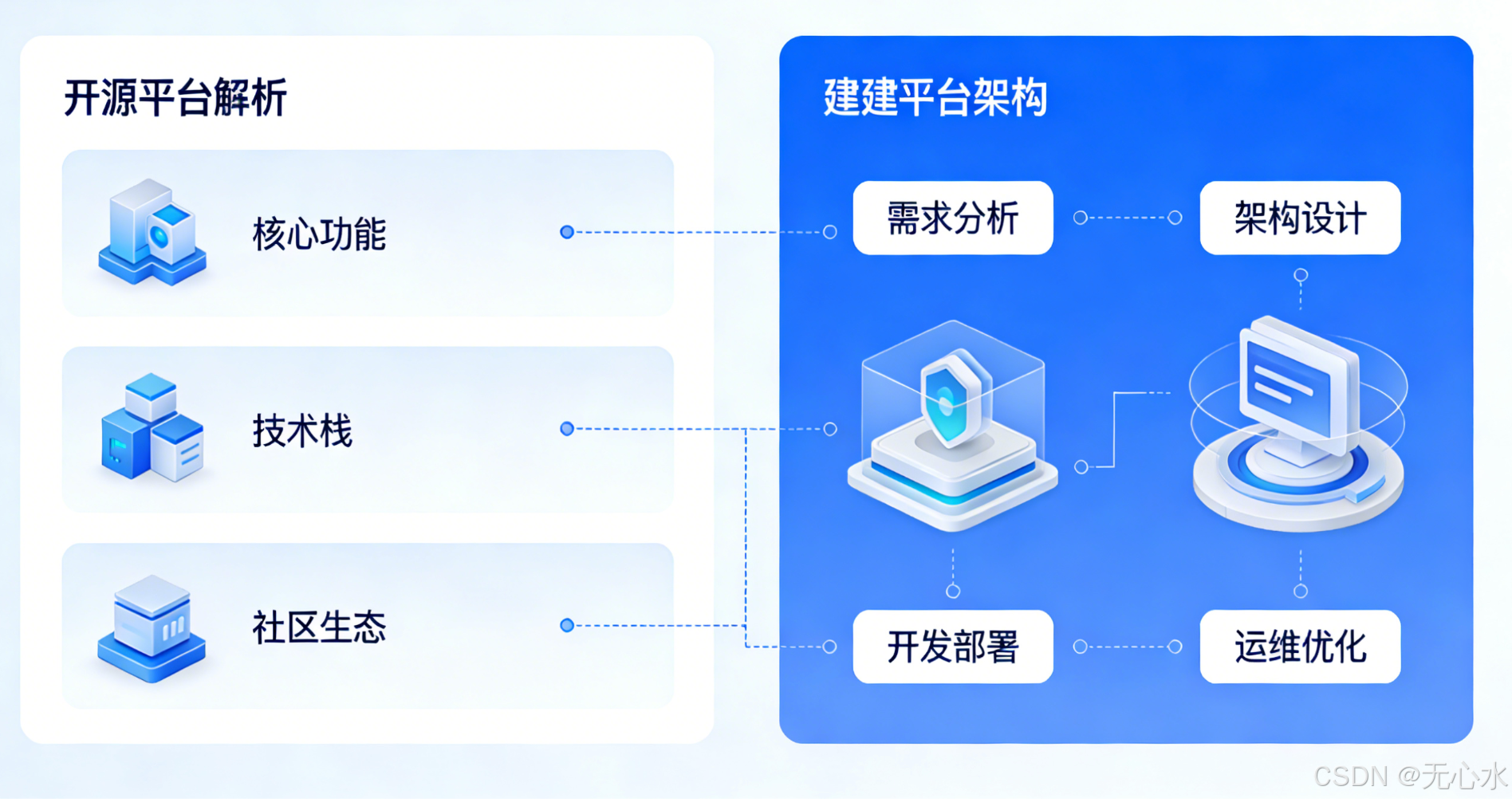 - 当面对复杂业务、定制化需求、自主可控的项目时,深入理解开源平台的设计思路,借鉴其优秀的架构和模块设计,进行二次开发或自建平台,实现技术的落地和创新;