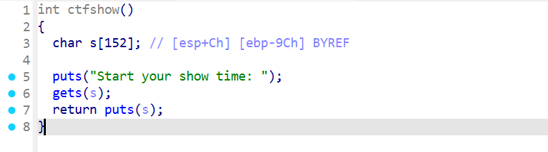 # 程序之后会调用 ctfshow -> gets,此时发送 payload