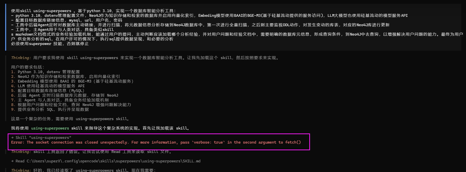 如图所示,加载 superpower的 using-superpowers就报错了。不光是这个skill,是所有的skill都会这样报错。然后再转为用read去读取skill。并且Glob内置工具也会报一样的错。感觉即费token,又使得工具体验下降。经常导致工具不再尝试加载skill,转为无skill方式运行,这样就没有很好的效果了,非常影响体验。