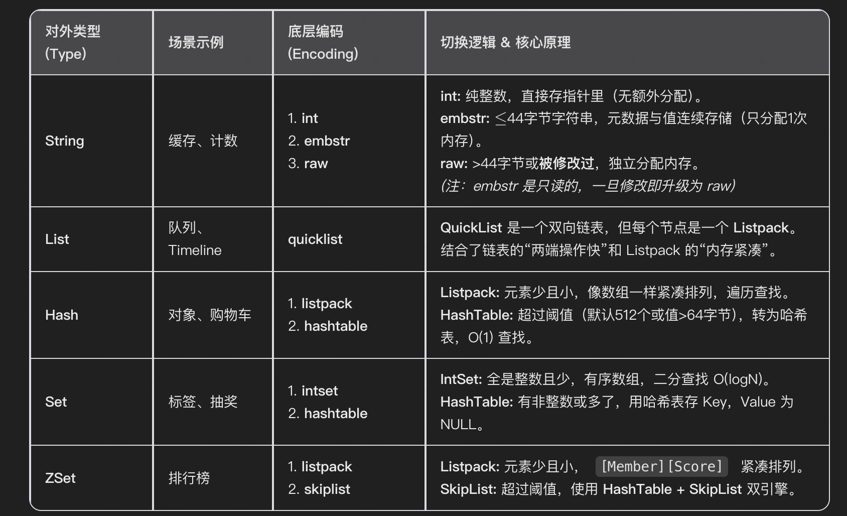 内层(编码层): Redis 根据数据量大小和类型,自动切换的底层实现(如 Listpack, QuickList, HashTable, SkipList),以在"省内存"和"高性能"之间寻找平衡。