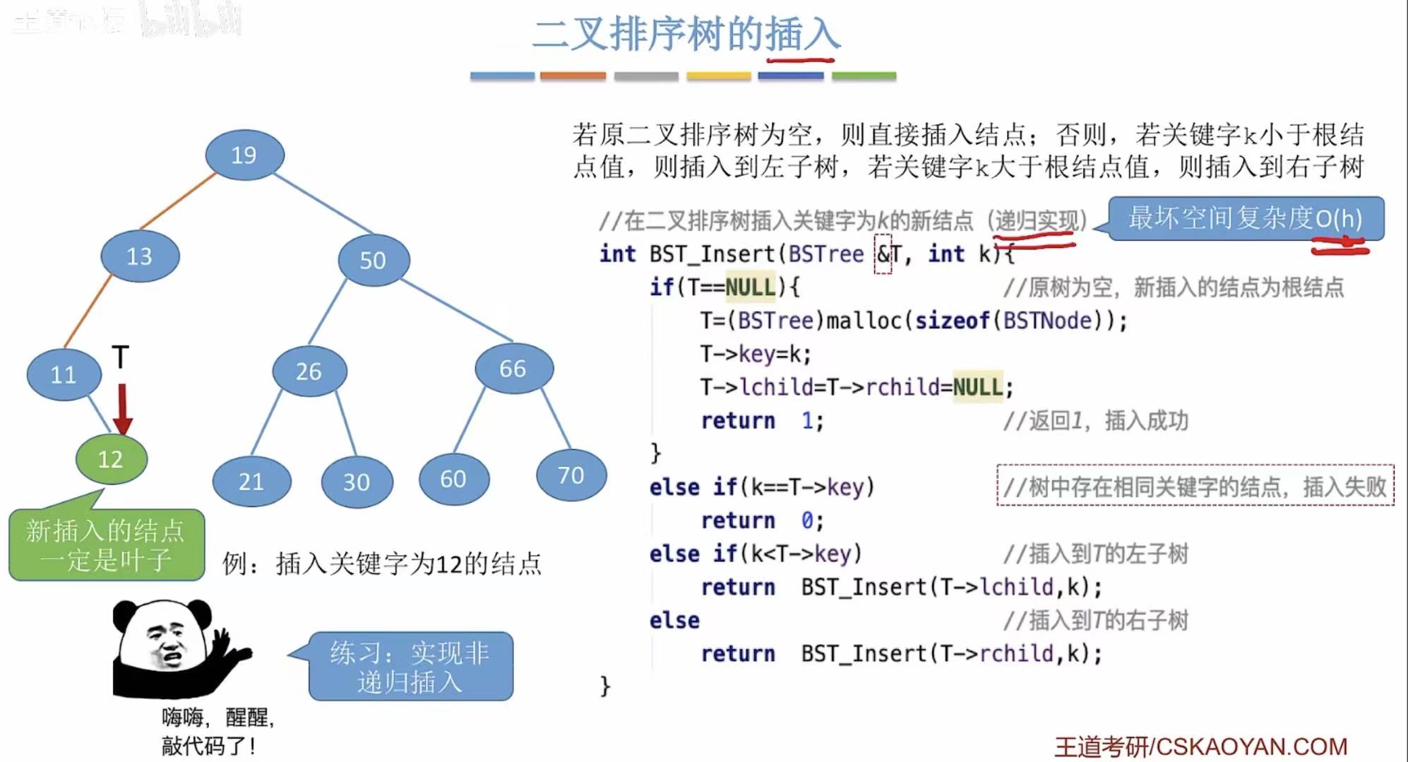 // 在二叉排序树 T 中插入关键字为 k 的新结点(递归实现)
