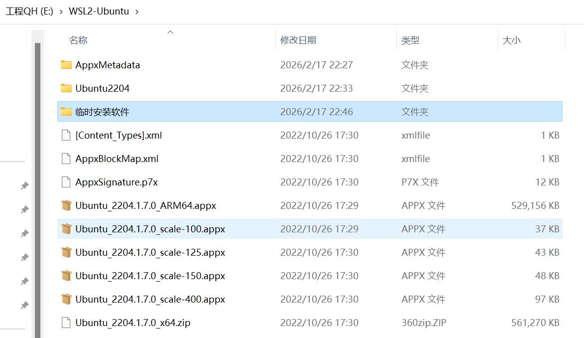 Ubuntu_2204.1.7.0_x64.appx也改名为.zip - 解压到 E:\WSL2-Ubuntu\Ubuntu2204(新建这个目录)