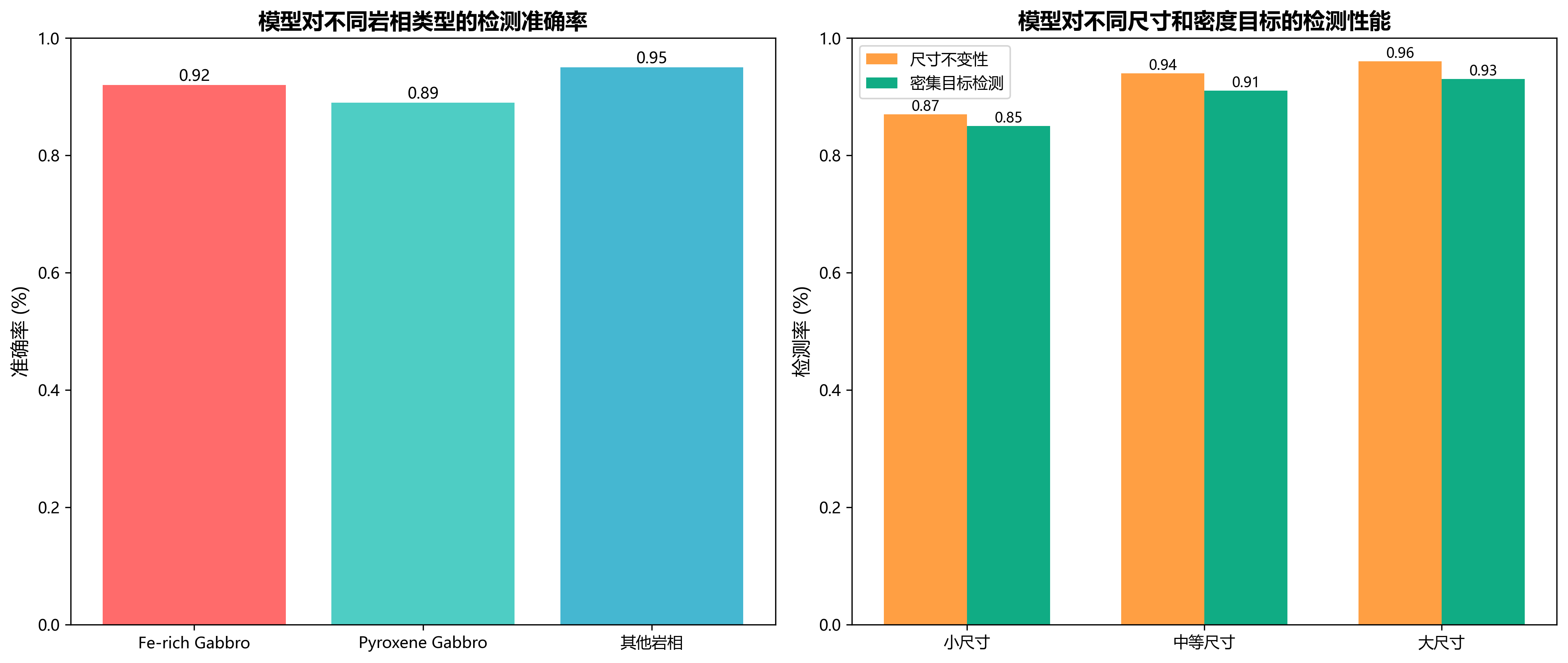 特别值得注意的是,模型能够有效区分外观相似的岩相类型,如Fe-rich gabbro和Pyroxene Gabbro,这得益于YOLO11-EfficientViT模型中EfficientViT特征提取器对细微特征的捕捉能力。此外,对于尺寸较小或分布密集的岩相目标,模型也能实现准确的检测,这表明模型具有良好的尺度不变性和密集目标检测能力。