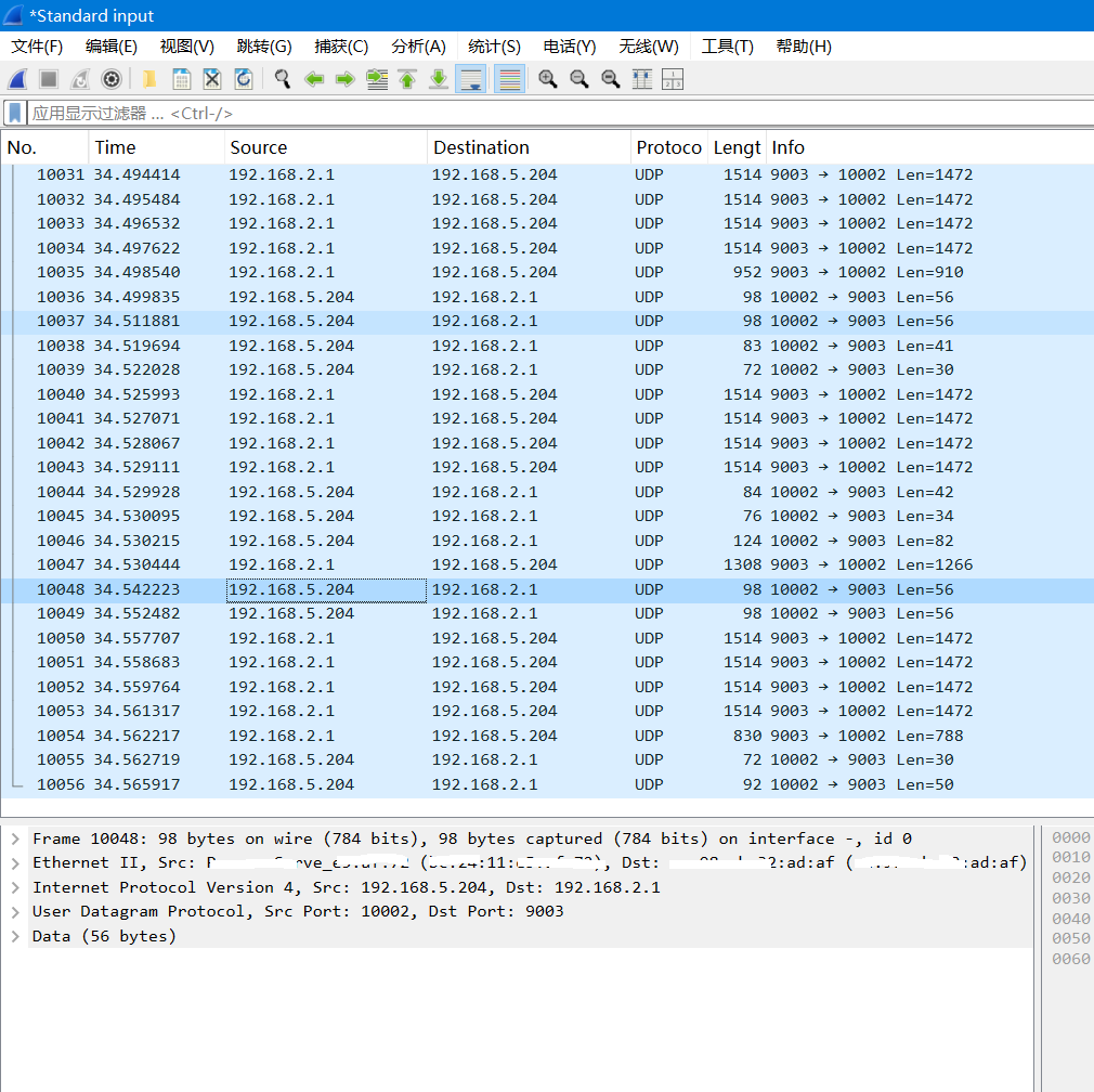 抓包后可以看到是通过udp协议的9003和10002端口通信的