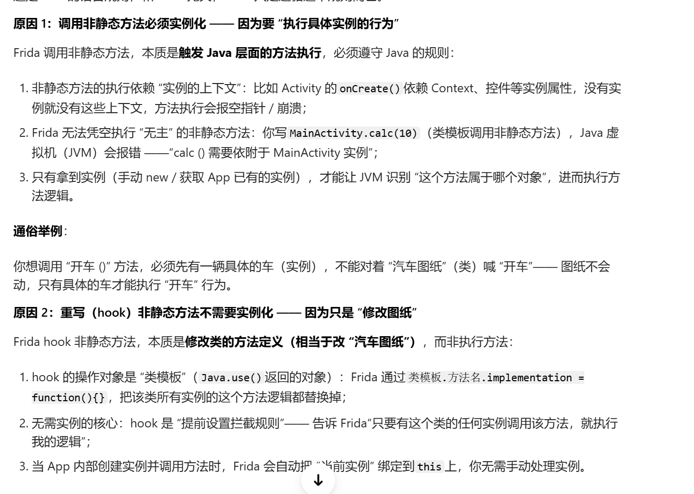 Java.use()Frida 核心 API,根据"完整类名"获取目标类的操控器, 参数必须是"包名+类名":比如 com.ad2001.frida0x1.MainActivity:类名必须和 APP 源码中完全一致(区分大小写)