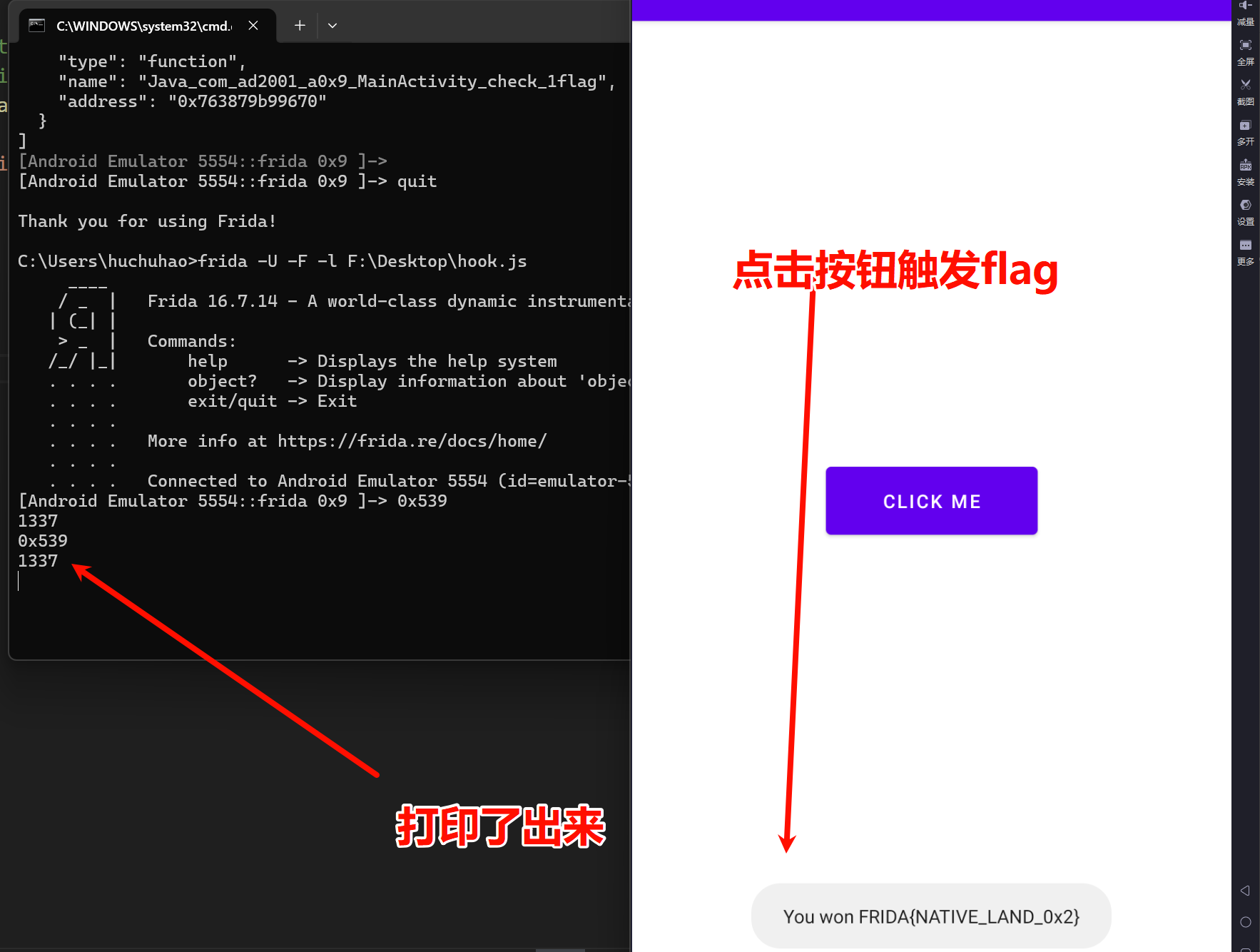 这里我们可以清晰看到,输入的数字满足random_num * 2 + 4 == input_number就会弹出flag。如果用frida的话,就是hook这个get_random方法即可。这里我们需求很简单,hook随机数生成器,得到随机数后frida终端弹出这个值即可。利用hook,我们可以让值永为固定值,抑或是简单得到值进行运算。