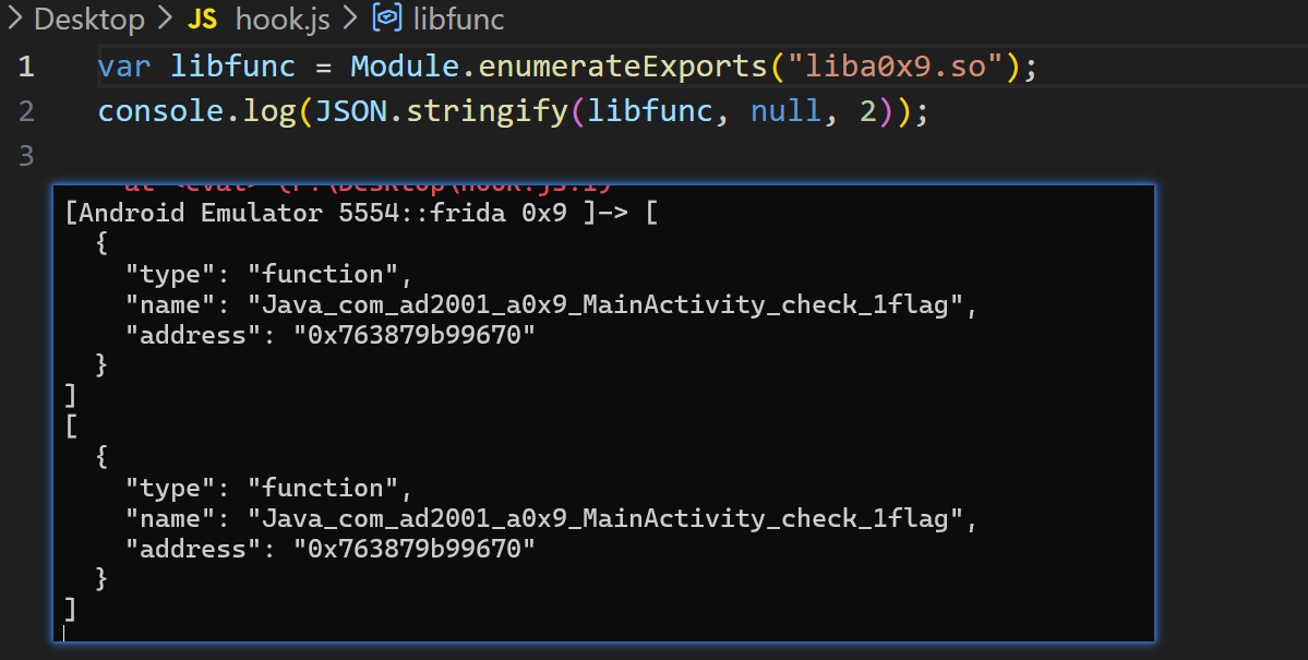 var hook = Java.use("com.ad2001.frida0x1.MainActivity");