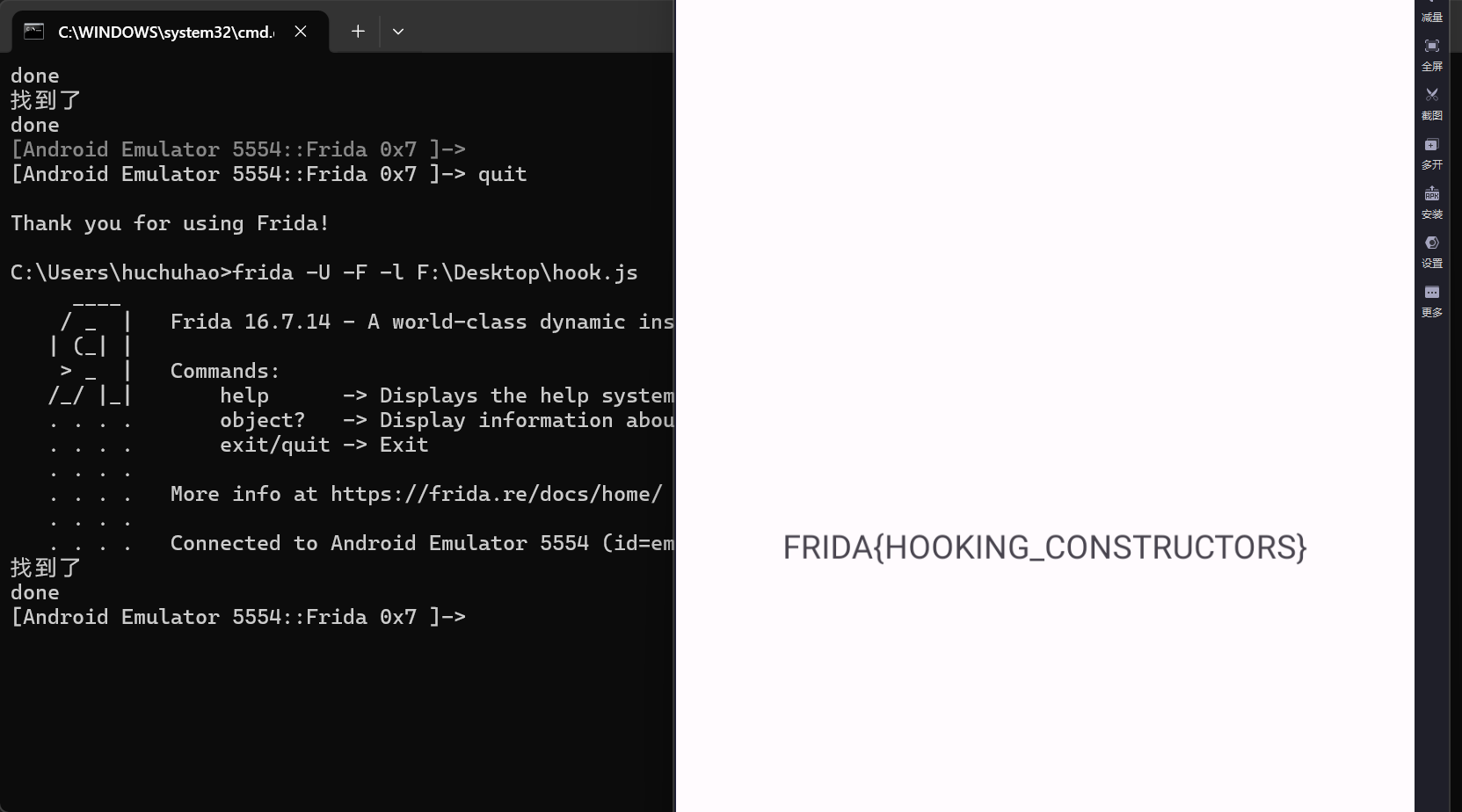 hook之前的准备工作就不多说了,首先安装完毕frida环境,一定要启动两个终端,一个是adb终端(最高权限),一个是frida终端。手机或模拟器开启adb调试模式。frida可以和python、go、c等联动,而它hook的核心语言是js,因为其用了QuickJS这个东西,这是在frida.re阅读到的。