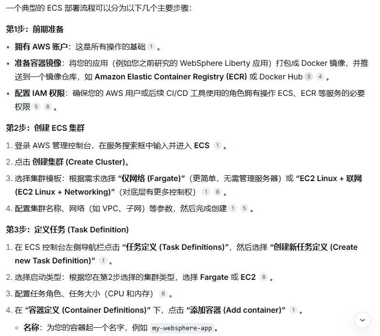 您可以将这些命令集成到 CI/CD 流水线(如 Jenkins、GitHub Actions)中,实现全自动化的持续部署。如果过程中遇到权限不足等问题,请检查 IAM 角色是否包含 ecs:RegisterTaskDefinition、ecs:UpdateService、ecs:DescribeServices 等权限。
