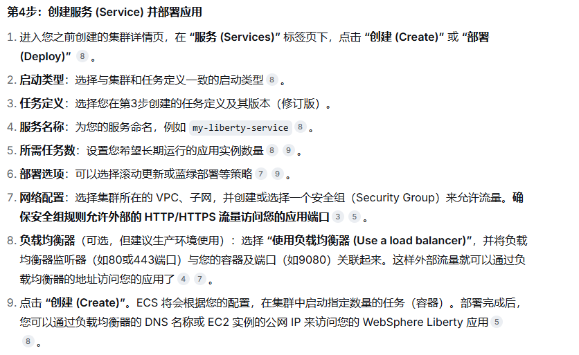 服务 (Service):负责确保指定数量的任务(即基于任务定义运行的容器实例)始终处于运行状态。它还会与负载均衡器集成,实现流量分发和滚动更新