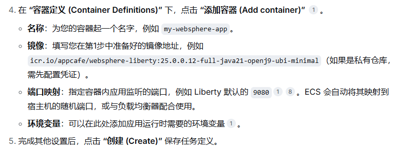 成功后,AWS 会返回新注册的任务定义 ARN 和版本号(如 my-liberty-app:3)。