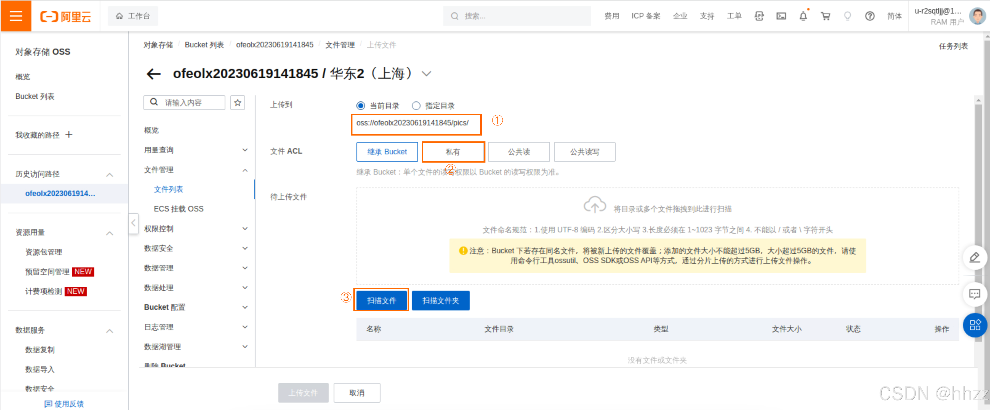 文件管理菜单,点击文件列表,点击pics目录,点击上传文件功能,再次上传demo.jpg,并在上传时设置文件ACL为公共读(如下图①所示)。