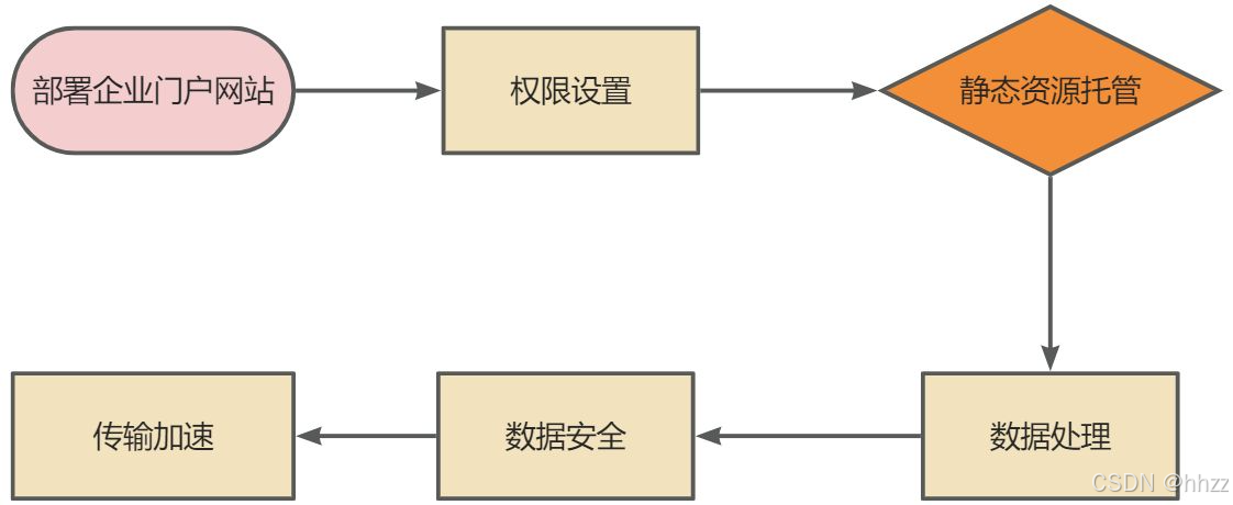 本文是为了帮助企业门户网站上云而设计,实验使用HTML完成网站前端页面的编辑和呈现,使用OSS完成网站静态页面的托管和视频图片等文件资源的托管;同时,企业门户网站需要针对不同的访问用户设置不同类型的访问权限,需要对重要数据进行落盘加密,加强数据安全;另外,网站还需要支持用户在线处理图片、支持对文件进行版本管理、支持全球访问传输加速等优化访问体验的功能。网站架构如下: