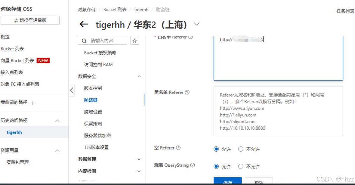 - 单击数据安全,选择防盗链菜单,找到防盗链按钮。