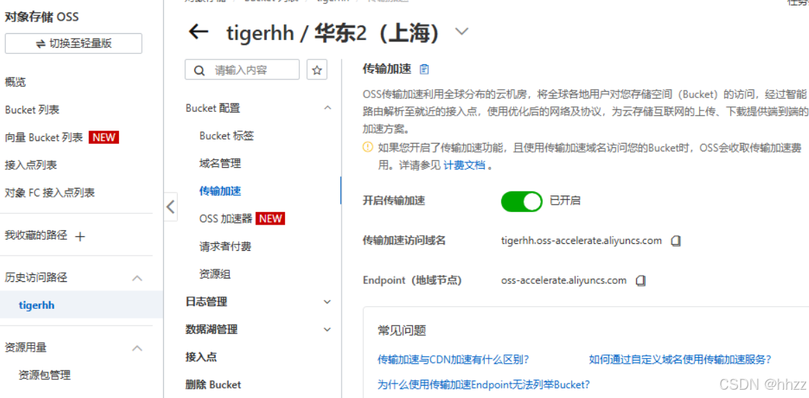 单击Bucket配置,选择传输加速菜单,找到开启传输加速按钮。