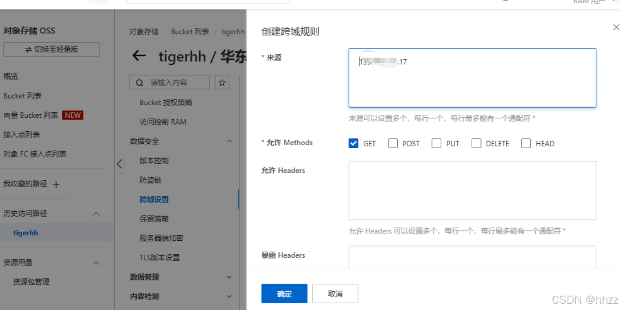- 单击创建规则,来源设置为ECS公网地址,允许Methods为Get。点击确定完成跨域设置。