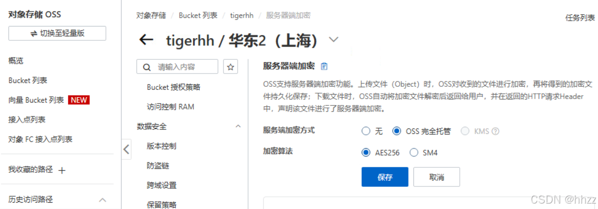 - 点击设置按钮,选择服务端加密方式为OSS完全托管,加密算法为AES256,点击保存完成服务端加密功能开启。