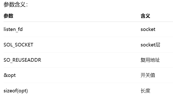 setsockopt(listen_fd, SOL_SOCKET, SO_REUSEADDR, &opt, sizeof(opt));