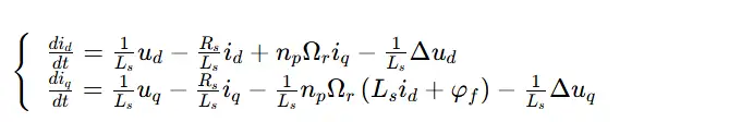 其中,Rs(定子电阻)、Ls(定子电感)、φf(永磁磁链)等参数的动态漂移,以及Δud、Δuq代表的逆变器非线性扰动,都会导致模型失配,进而恶化控制性能。